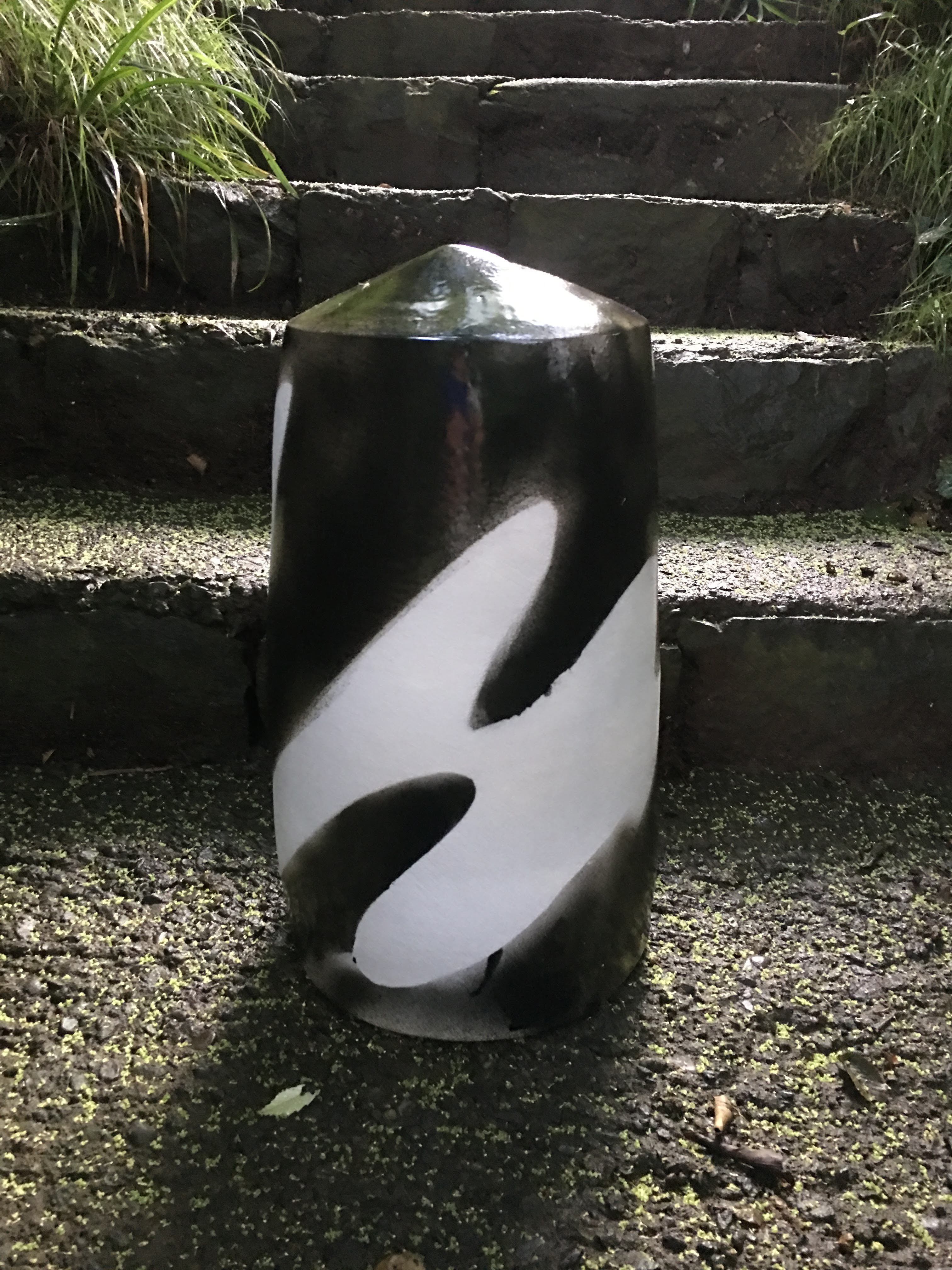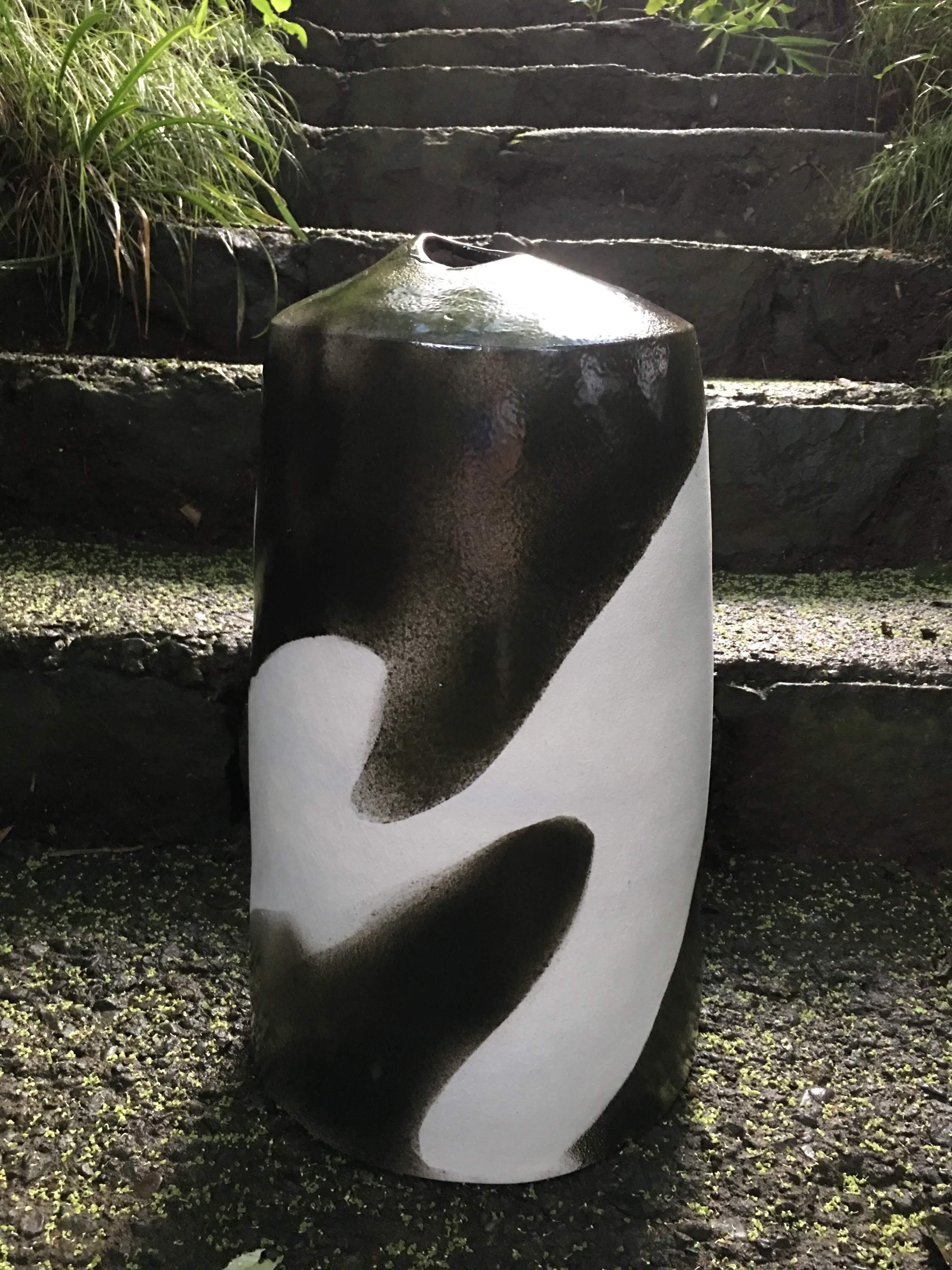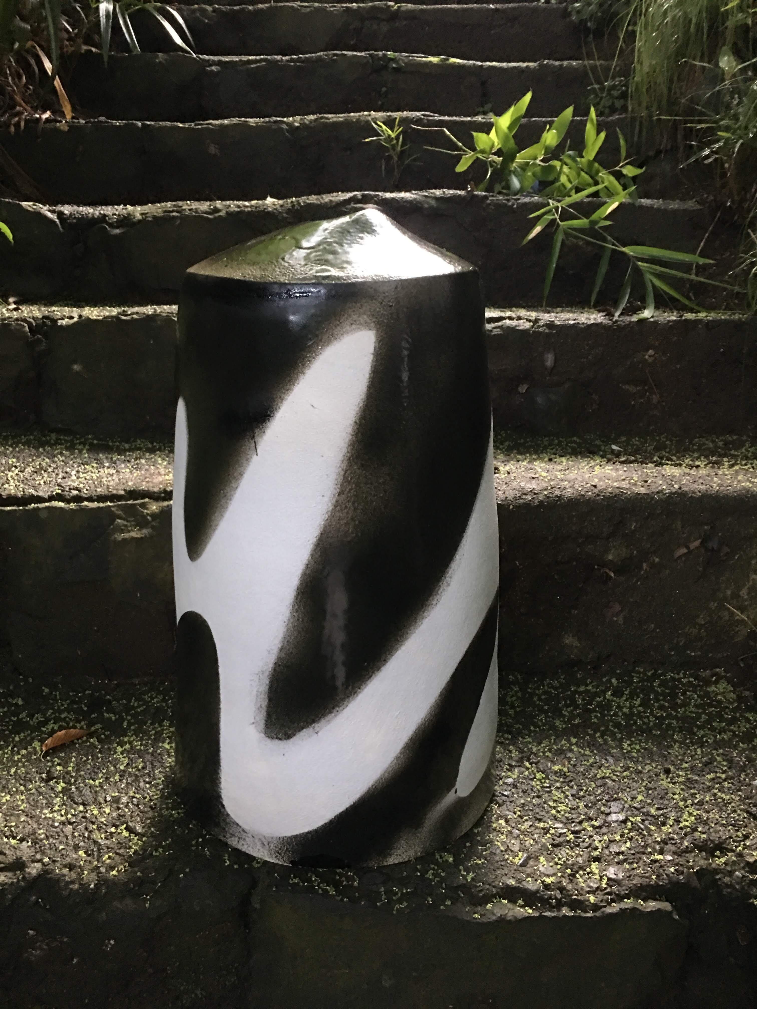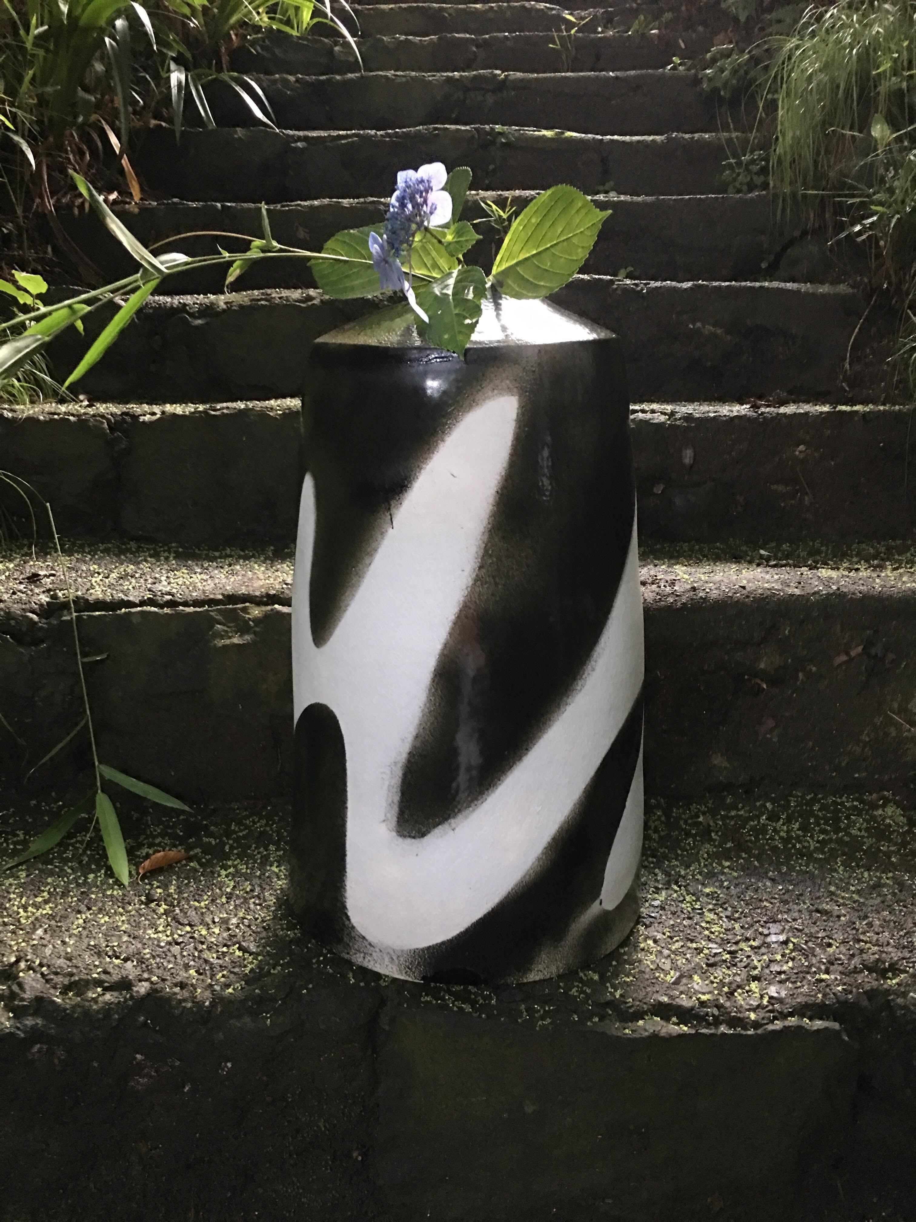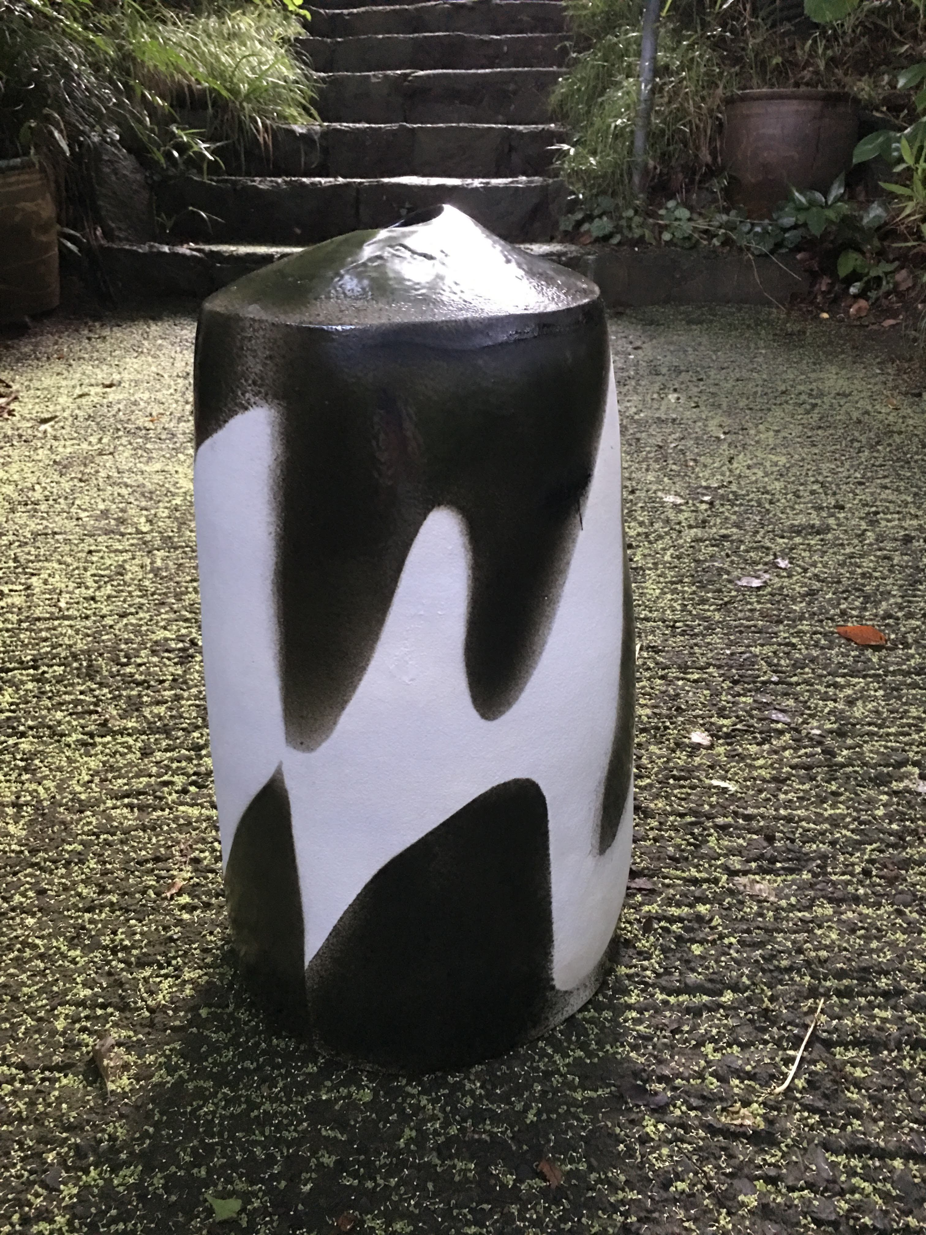 高さ50センチ直径25センチのオブジェです。小さな口が上部にありますので、背の高い枝物や造花は一本だけ入ります。